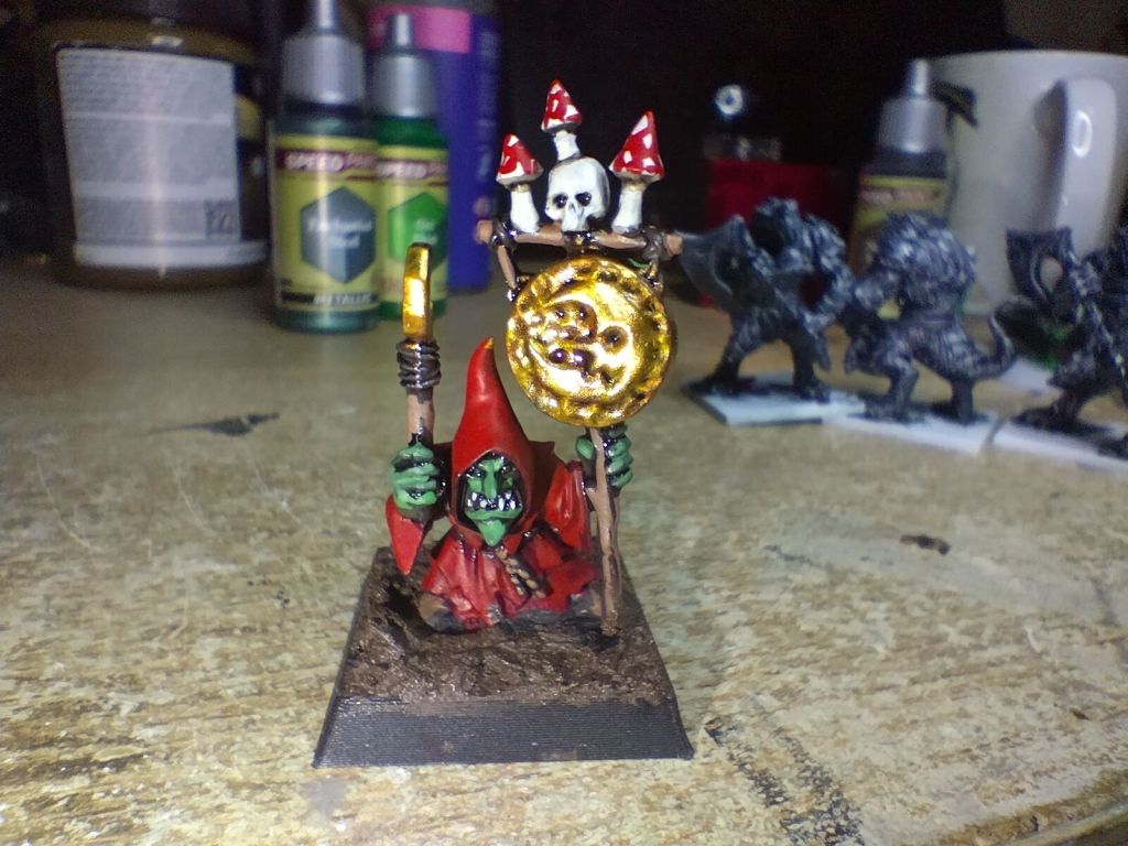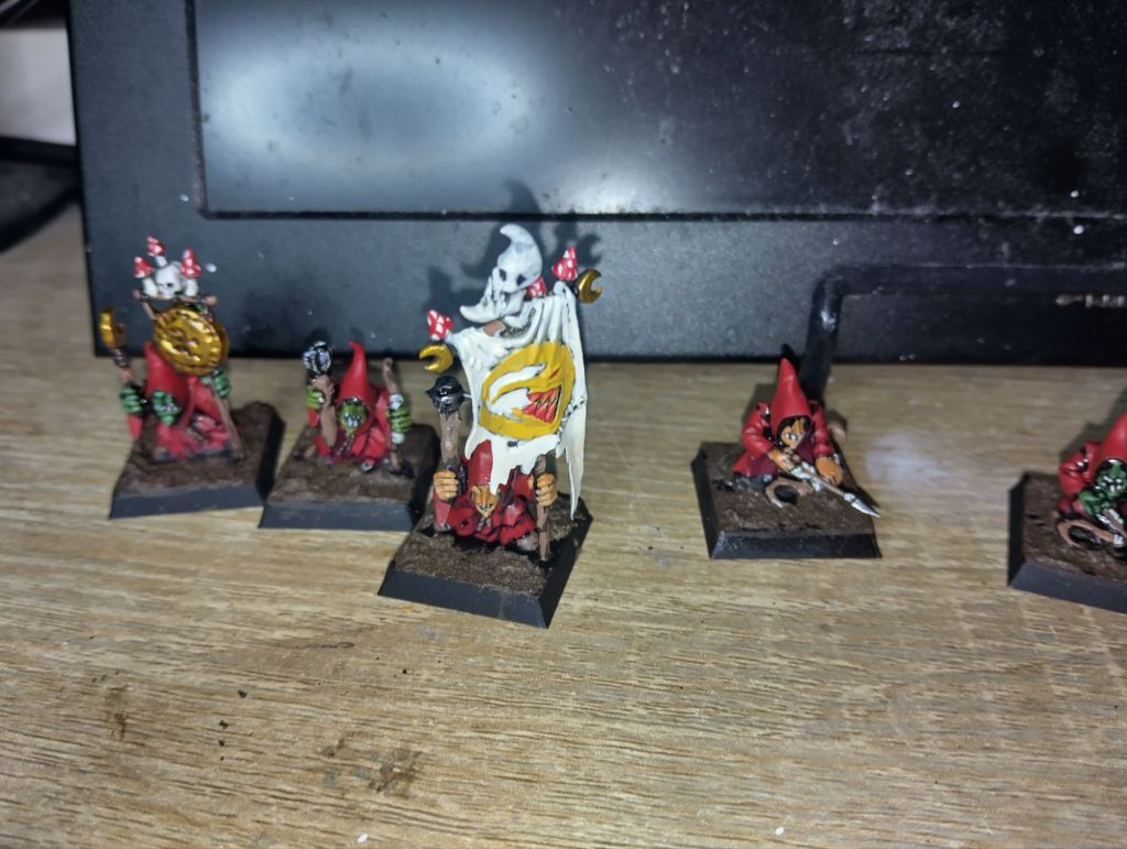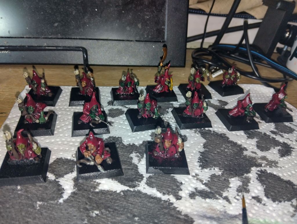 Speaking of gobbos, I have been slowly getting through this unit of Night goblins that I use as Gnoblars in Age of Sigmar for my Ogor Mawtribes army. With the exception of the bases and a banner, 5 are fully painted and the others washed. Hoping to get this unit finished by June.