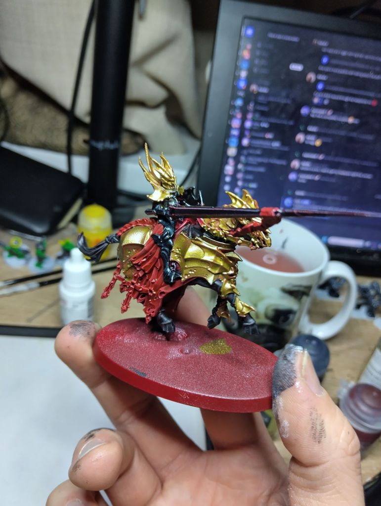 Also for my Soulblight Gravelords army, I started work on this Blood knight. I am working on a formula for getting my vampires painted up quickly but to a standard I am happy with. This was primed Army Painter dragon red, dry brushed white, then blocked in using Citadel’s Black Templar and Blood Angels Red from their contrast range, and Army Painters Hoplite Gold and Enchanted Steel from their Speed Paint Metallic Range.