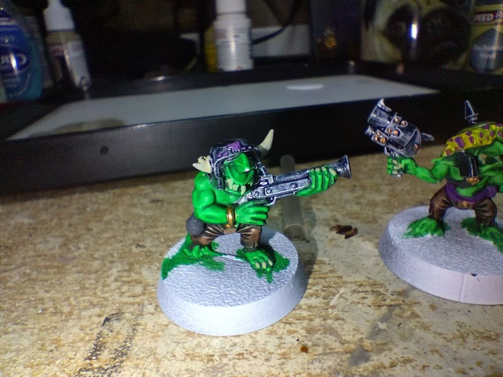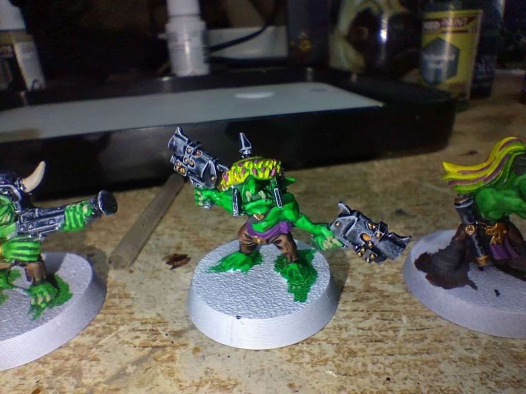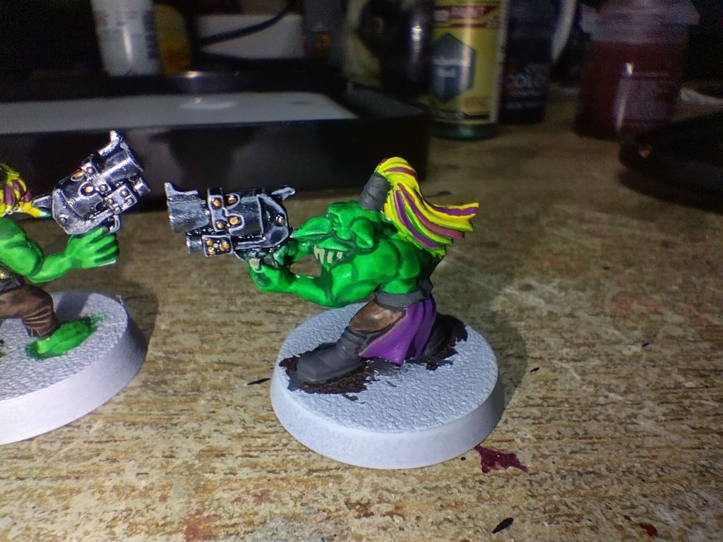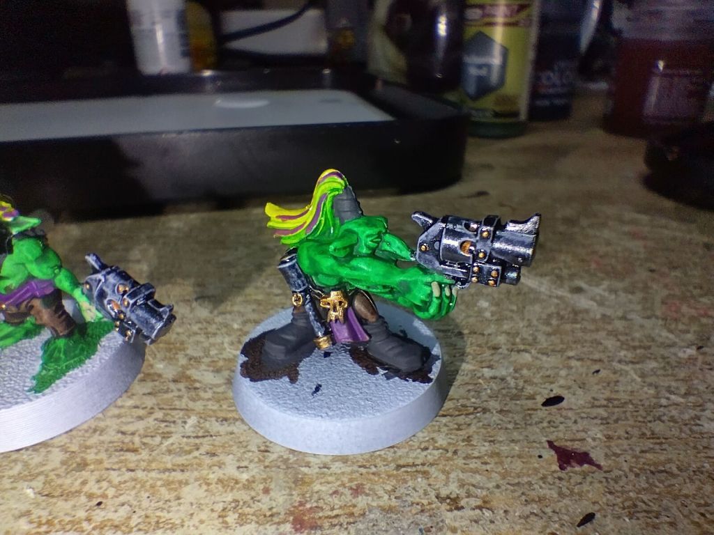 These gretchin I started painting up for a Space Weirdos warband. I started from a white primer and used Army Painter’s Leather Brown, Enchanted Steel and Orc Skin speed paints to base coat, alongside Citadel’s Bad Moon Yellow contrast for the yellows.